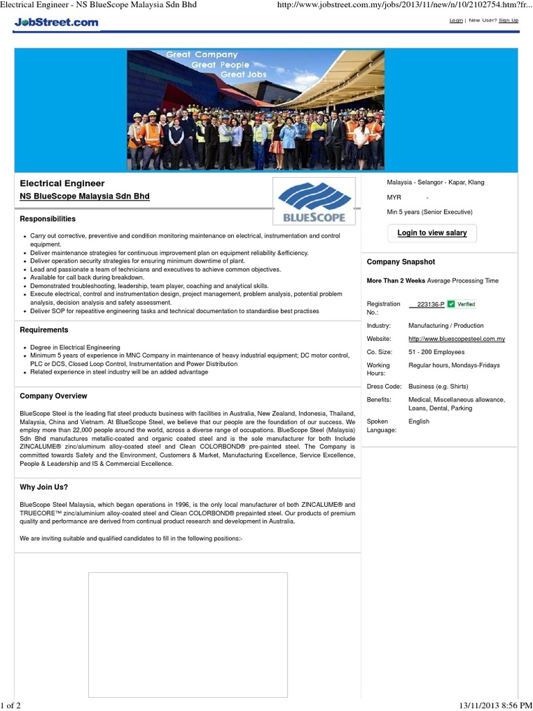 Electrical Engineer Ns Bluescope Malaysia Sdn Bhd Instrumentation Employment