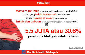 Ia juga boleh membuat sukar bagi anda untuk bergerak bernafas dan melakukan perkara lain bahawa orang yang berada dalam berat badan yang sihat dapat melakukannya dengan mudah. Berpunca dari gaya hidup yang tidak sihat dan pemakanan yang tidak seimbang. Obesiti di malaysia telah meningkat dengan kadar yang tinggi iaitu 16 8 juta bersamaan dengan 60 daripada 28 juta penduduk.