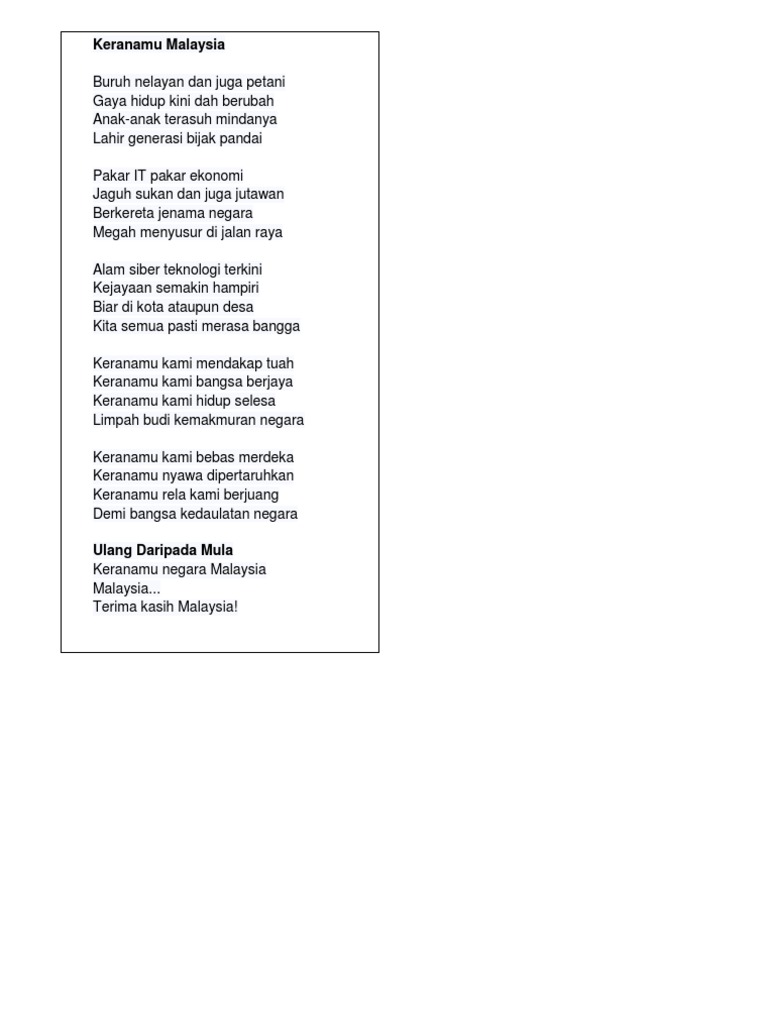 Keranamu kami mendakap tuah keranamu kami bangsa berjaya. Alam siber teknologi terkini kejayaan semakin hampiri biar di kota ataupun desa kita semua pasti merasa bangga. Pakar it pakar ekonomi jaguh sukan dan juga jutawan berkereta jenama negara megah menyusur di jalan raya.