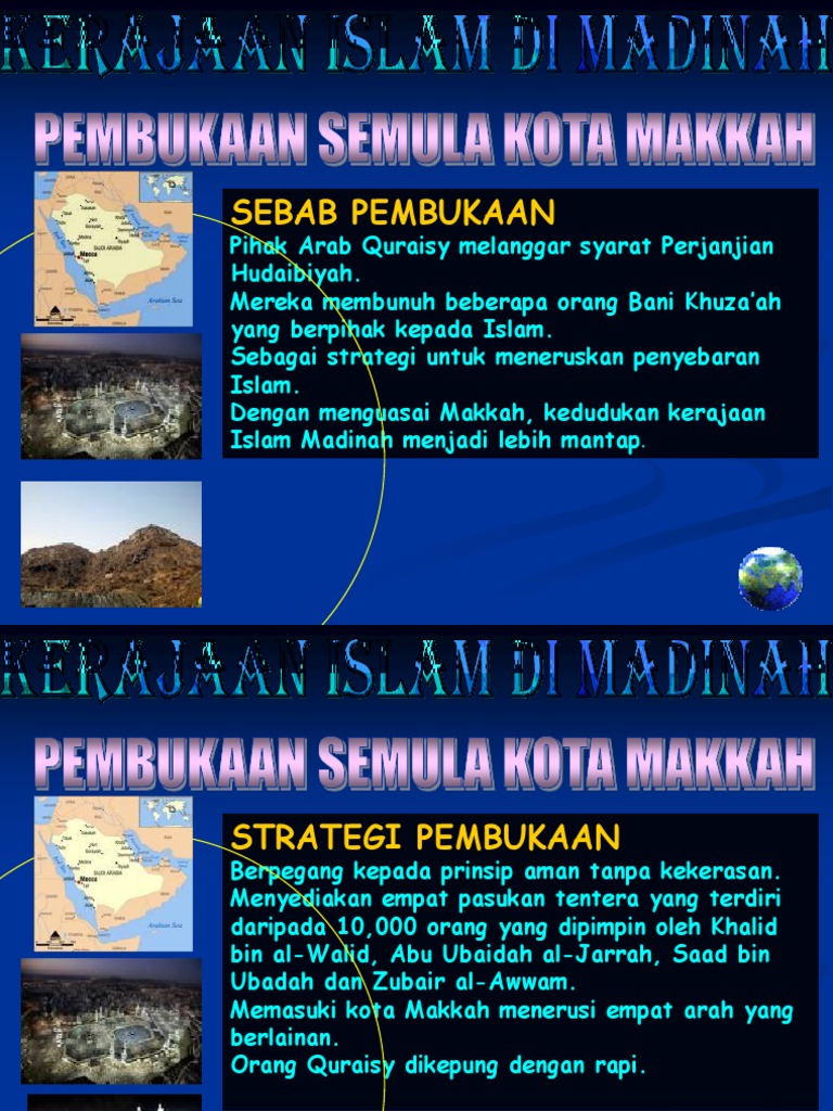 Sebab pembukaan semula kota makkah. Kota makkah ialah tempat lahirnya agama islam. Pembukaan kota mekah bahasa arab.