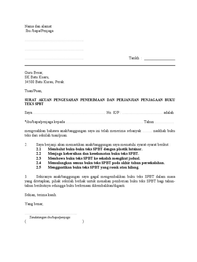 Surat Akuan Pengesahan Penerimaan Dan Perjanjian Penjagaan Buku Teks