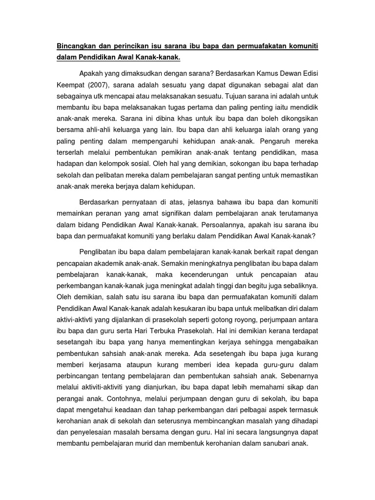Bincangkan Dan Perincikan Isu Sarana Ibu Bapa Dan Permuafakatan Komuniti Dalam Pendidikan Awal Kanak