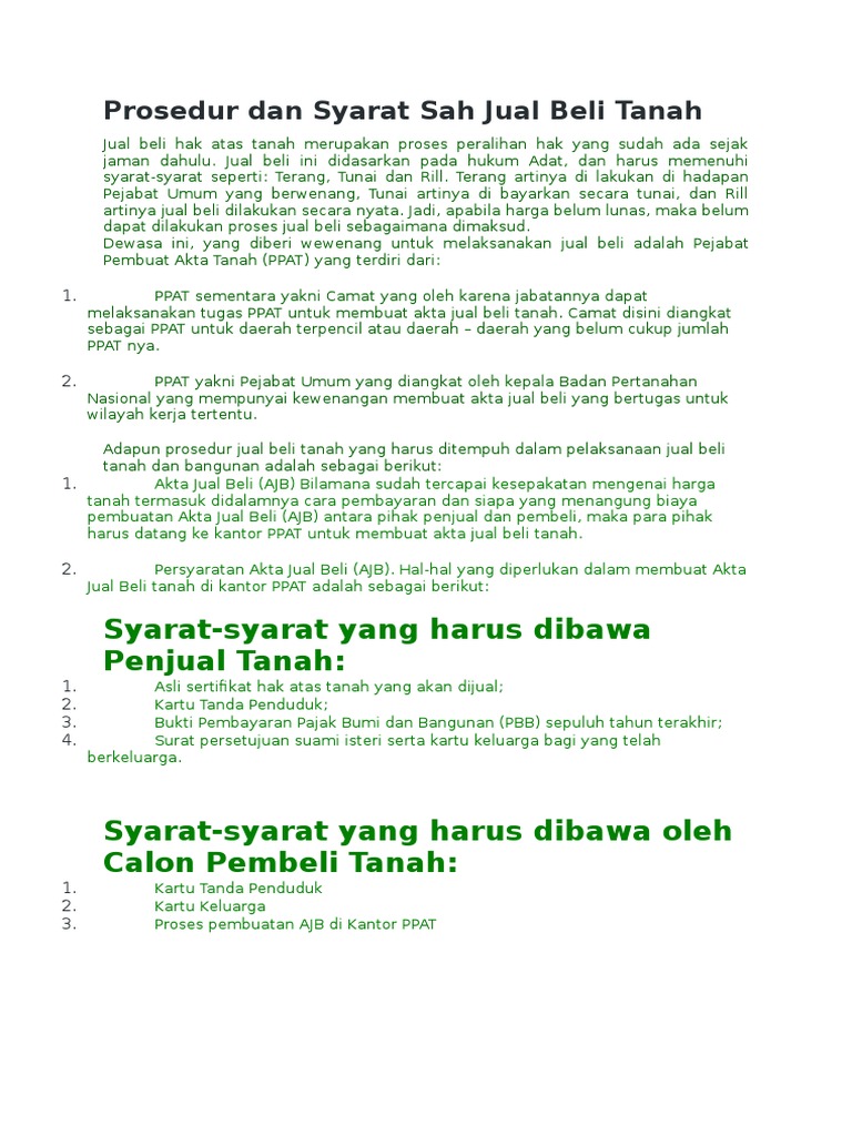 Proses jual beli tanah. Proses cara membeli tanah memiliki syarat jual beli tanah yang pada dasarnya cukup sederhana namun perlu kecermatan agar tidak terjadi masalah di belakang hari. Jual beli ini didasarkan pada hukum adat dan harus memenuhi syarat syarat seperti. Terang tunai dan rill.