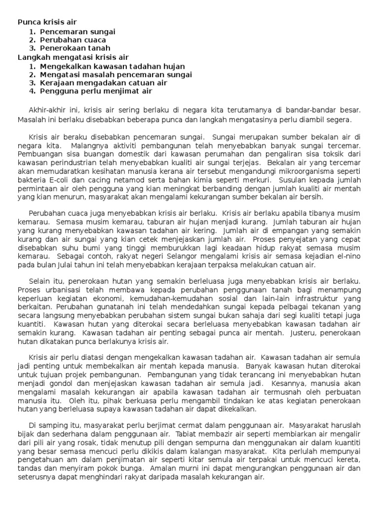 Punca berlakunya krisis air di malaysia. Selain beg plastik sampah jabatan pengairan dan saliran jps juga mendapati pelbagai sisa buangan termasuk peti sejuk lama tilam dan. Selain itu malaysia dirahmati dengan lebih dari 150 buah sungai yang merupakan sumber air mentah utama. Krisis air di klang 1998 krisis air lembah kelang 1998 merujuk kepada krisis yang berlaku di malaysia pada bulan februari 1998 apabila tiga empangan air di lembah kelang iaitu empangan klang gates empangan batu dan empangan semenyih mengalami tahap penurunan air yang serius disebabkan fenomena el nino.