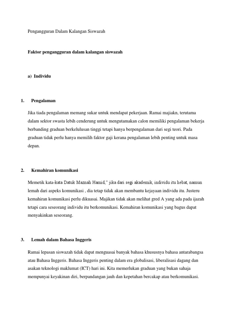 Punca utama pengangguran graduan adalah sikap memilih pekerjaan yang menawarkan gaji lumayan. Mutakhir ini kadar pengangguran di malaysia meningkat kepada 3 8 peratus. Kadar ini mengukur peratus penduduk di dalam tenaga buruh yang tidak bekerja.