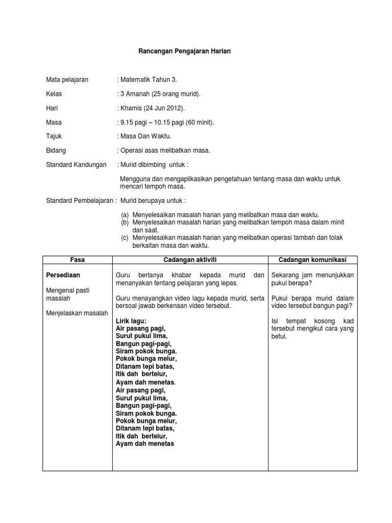 Contoh Rph Kssr Matematik Tahun 4 Masa Waktu